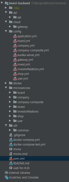 하나의 Git에 모든 프로젝트를 담는 방식은 좋다고 생각을 하지 않기도 하고 배포 시에는 CI서버에서 설정해야 하는 부분도 있지만 아래와 같이 구성한 이유는 마이크로 서비스에 대해서 해본 사람이 없고 공부를 한사람도 나밖에 없었기에 아키텍처 구조를 한번에 알기에는 하나의 Git에 같이 넣어 구성하는 게 좋다고 생각을 했습니다.